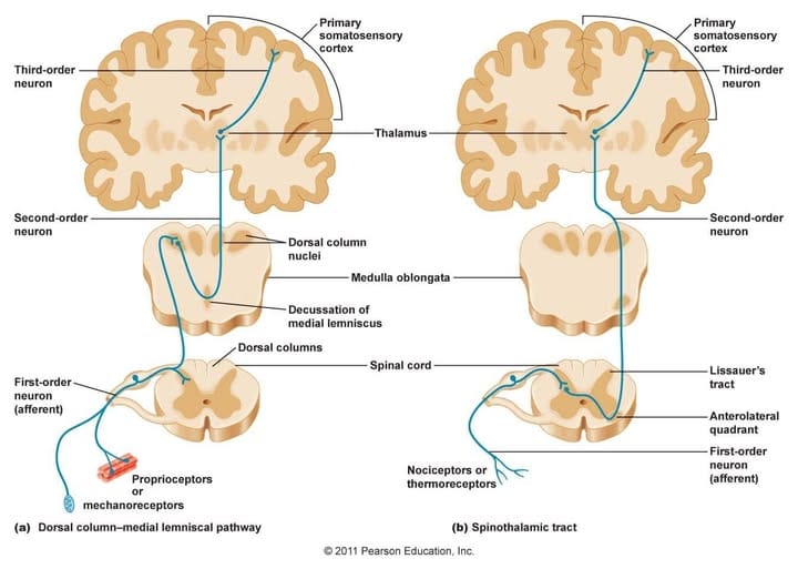 ☘️ Xúc giác là cảm giác từ môi trường bên trong hoặc bên ngoài đến từ các thụ thể. Thụ thể cũng có đến hơn chục loại có số lượng và mật độ khác nhau, nằm ở các tầng da khác nhau. Các thụ thể đi theo 2 đường dẫn truyền khác nhau lên não (như hình minh hoạ)